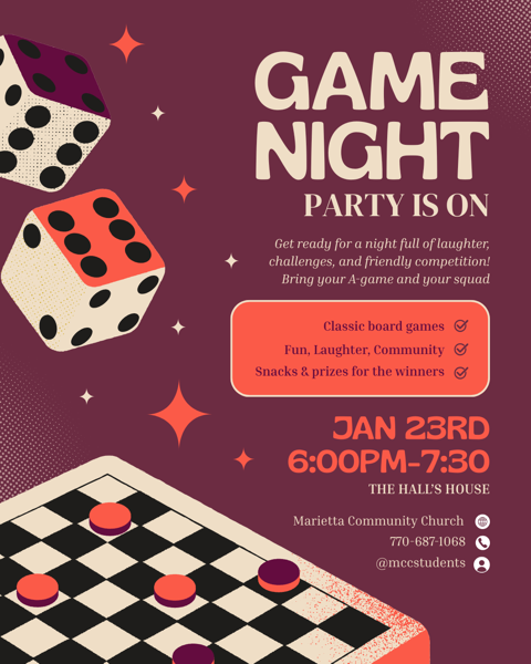 Middle School Game Night is back!! Friday Jan. 23, 6:00 - 7:00 p.m., at the Hall’s house. Don't miss out on this fun night!